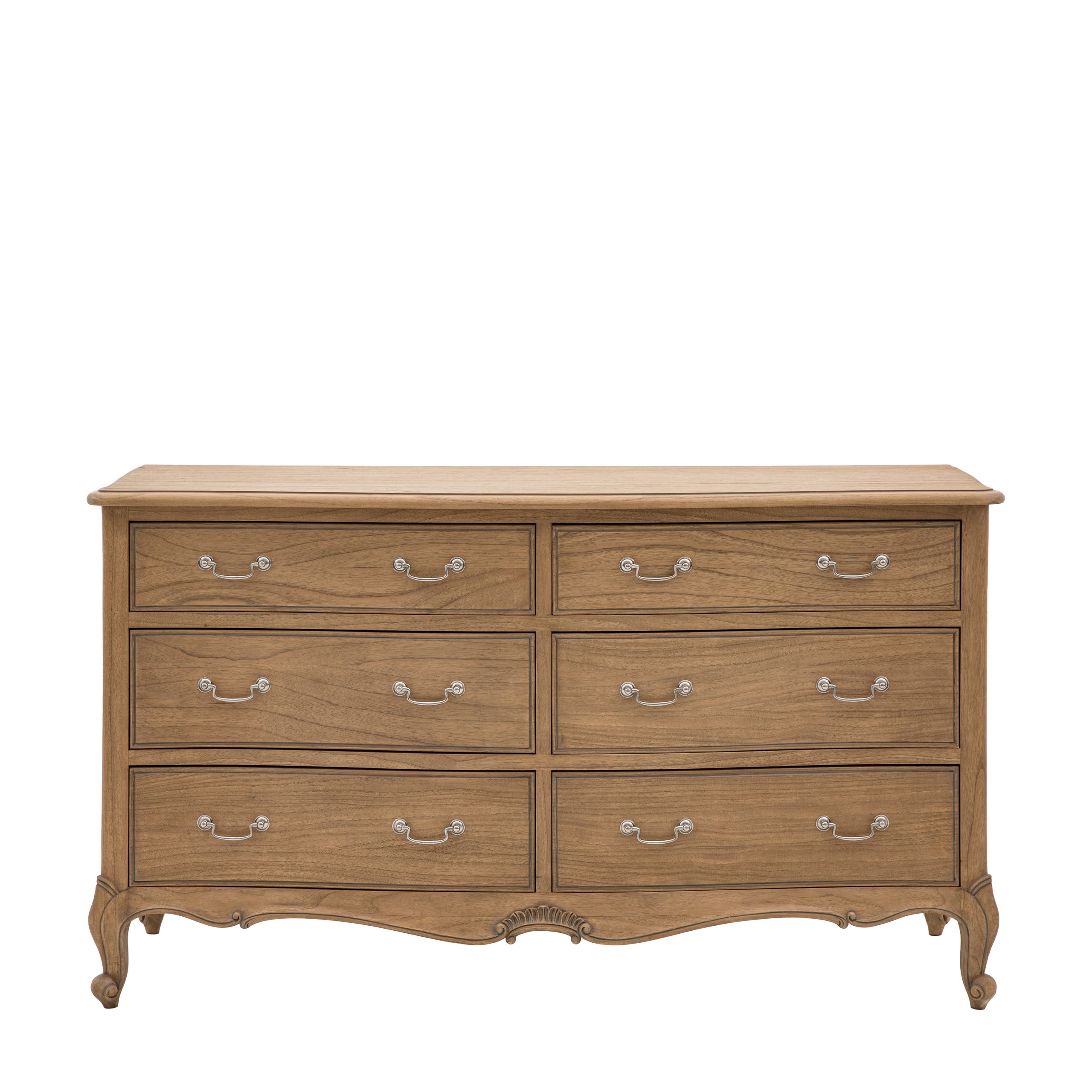 Heavily influenced by traditional French furniture designs, this beautiful chest of drawers exudes style and quality. The weathered finish shows the lovely grain of the Mindy ash with classy handles completing the look. Matching pieces available.