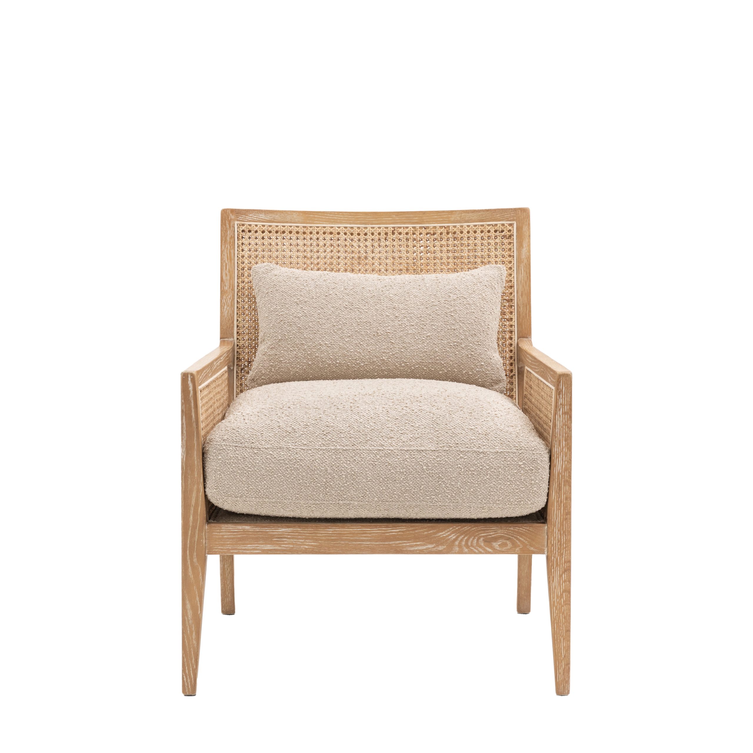 This armchair in Natural is a stylish and comfortable addition to any living space. Its rattan backrest and upholstered seat create a relaxed and inviting look. The wooden frame provides durability and a touch of natural warmth. Perfect for lounging with a book or enjoying a quiet moment.